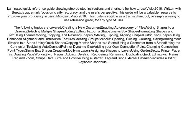 The content of the book is designed to be useful for people who have previously used earlier versions of. Connection Points, Alignment Control, Duplication and more. Buy Microsoft Visio 16 Introduction Quick Reference Guide - Windows Version (Cheat Sheet of Instructions, Tips & Shortcuts - Laminated Card) by Beezix Inc (ISBN:.